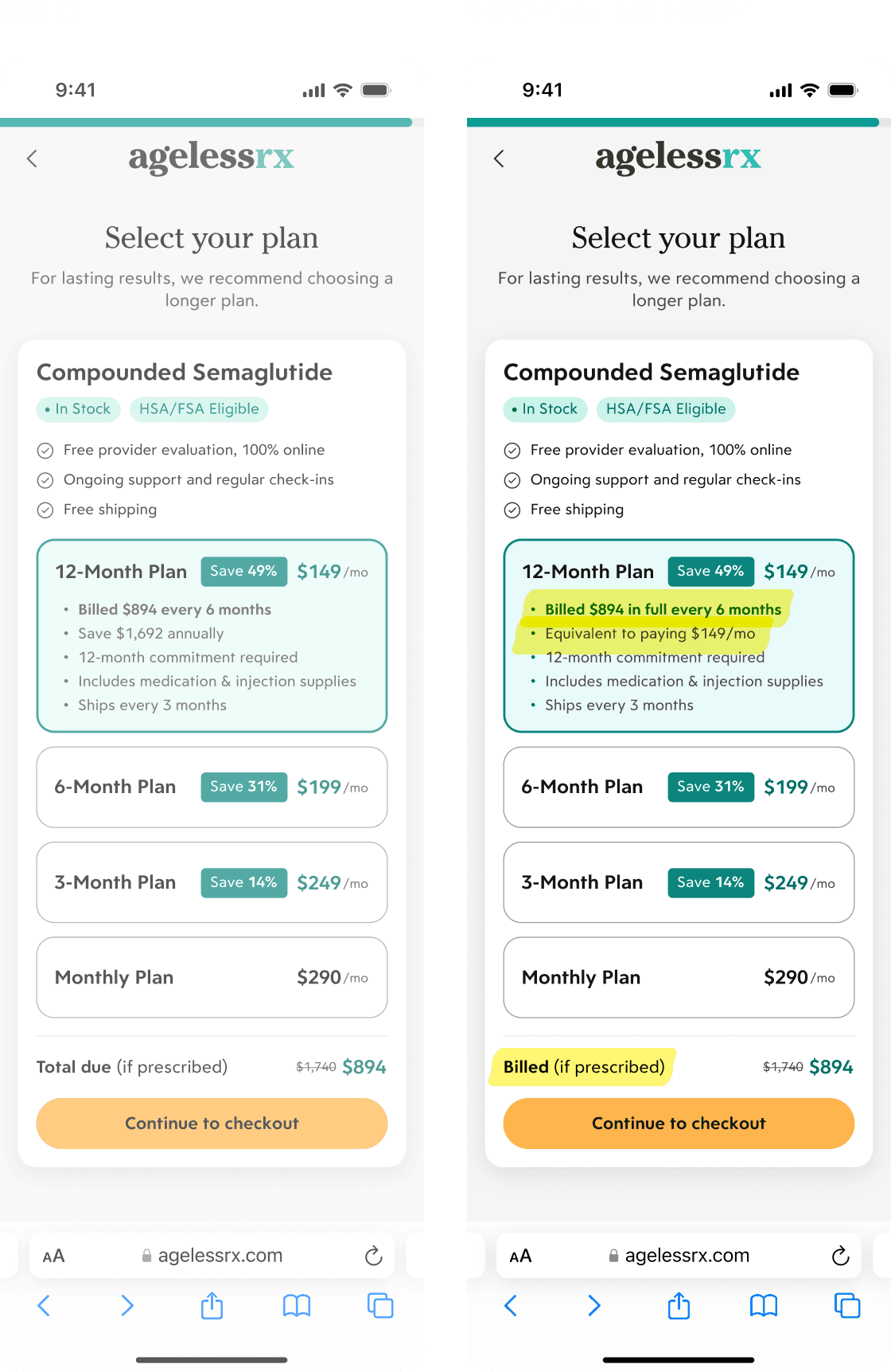 Since we were advertising a starting price of $149/mo, I countered that leading with "$1,194 billed upfront" would create even worse sticker shock without smoothly explaining the billing cadence. After a live design session with Customer Experience, we agreed on a simple solution that addressed their concerns while maintaining UX integrity: